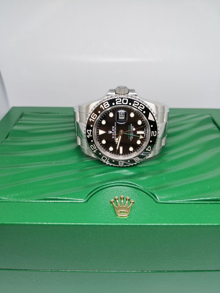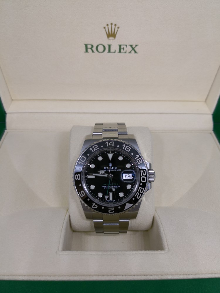 GMT-Master II black dial Oyster bracelet 116710BLNR with a Steel/Ceramic case, Steel strap, black/ indexes dial and Automatic movement. This watch features a Solid case back and comes with a Rolex International Warranty and all original box, papers and accessories